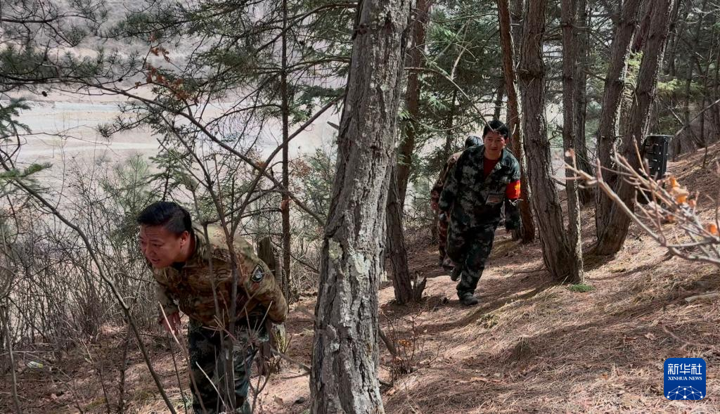 张路达(左一)和同事正在林间巡护。新华社记者 刁慧琳 摄