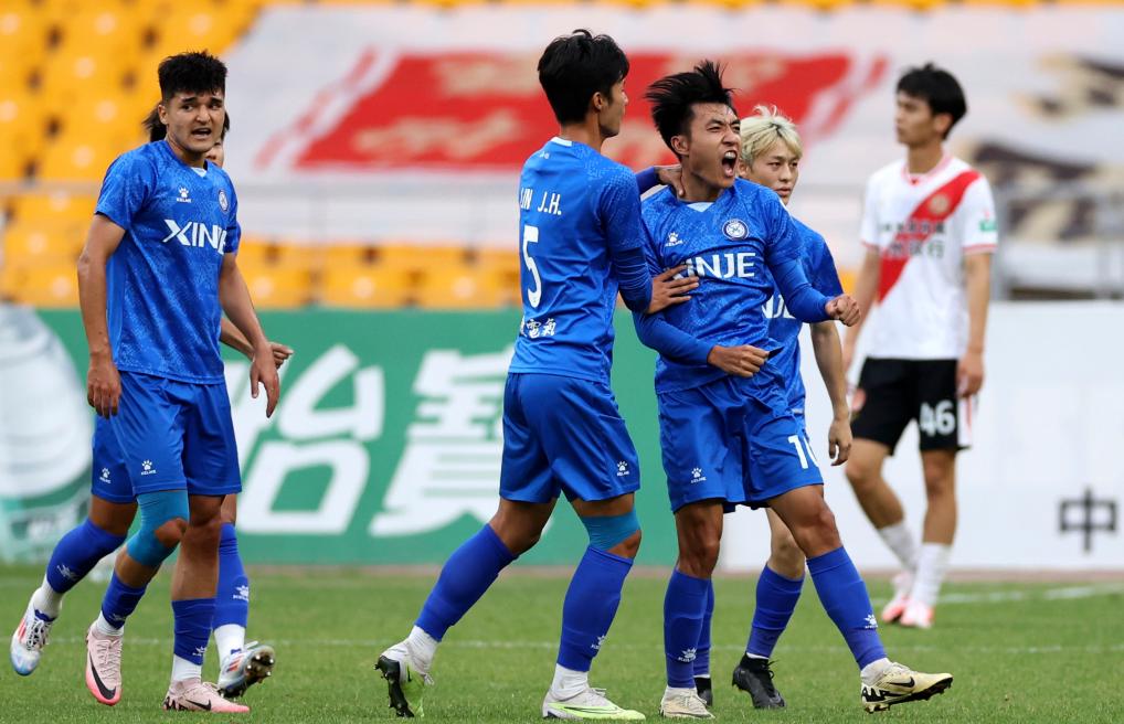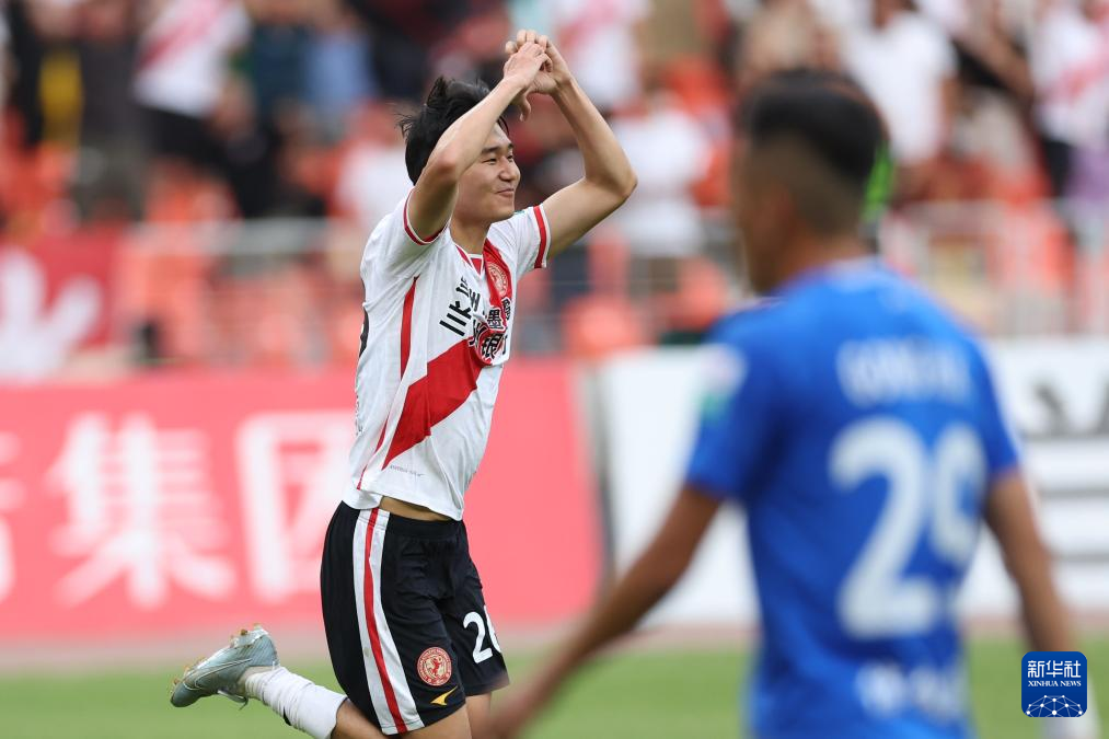 6月28日,兰州陇原竞技队球员梅景轩在比赛中庆祝得分。新华社记者 陈斌 摄