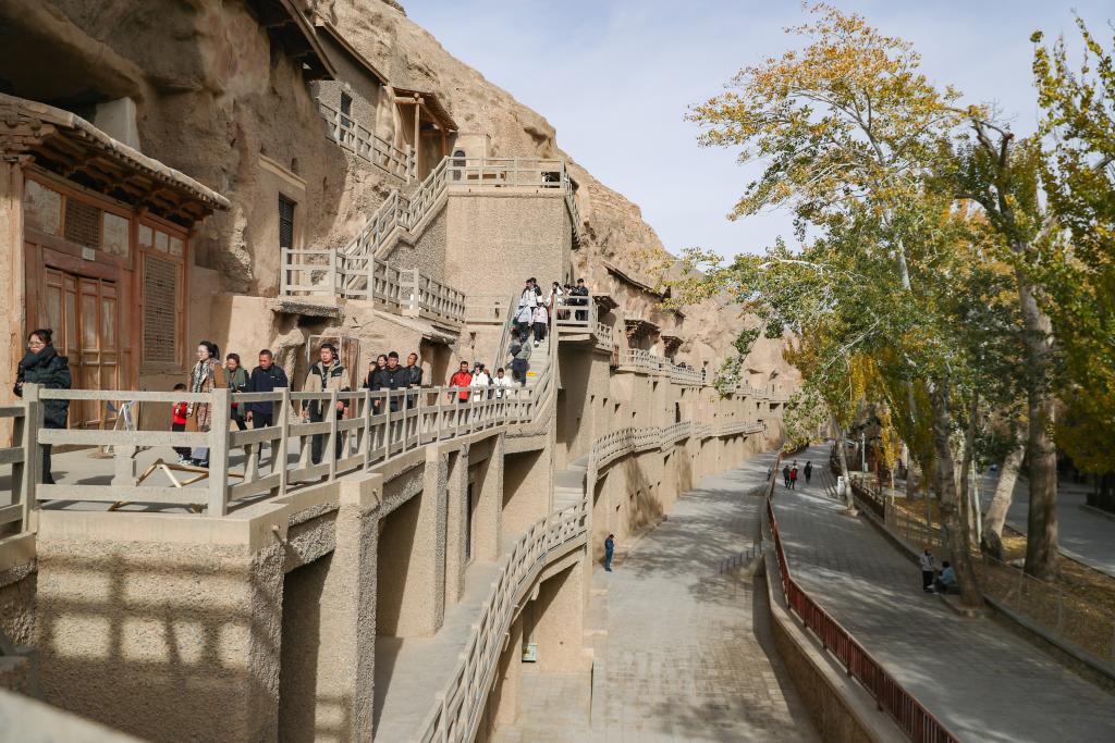 2024年11月14日,初冬时节,游客在莫高窟参观游览。新华社记者 郎兵兵 摄